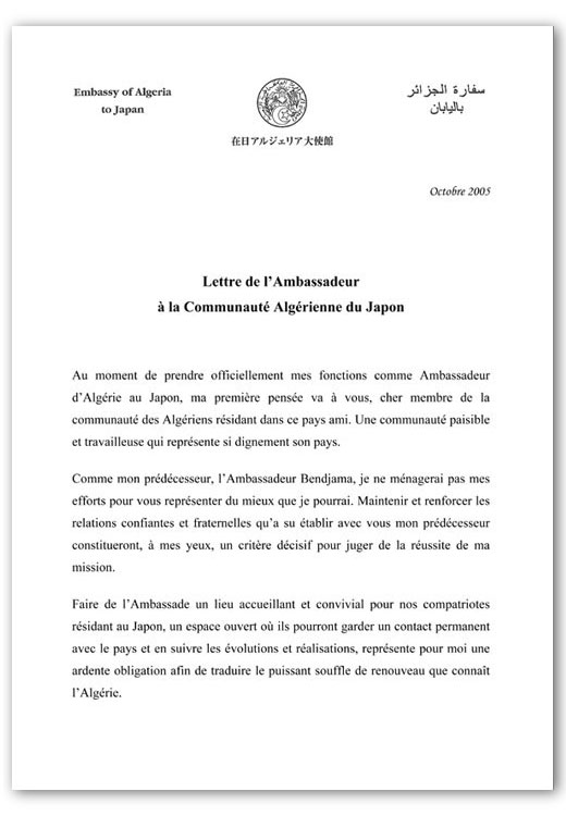 実際、日本とアルジェリアの経済的な関係がより拡大している今、両国間の芸術家、知識人そして、単なる市民レベルでのコンタクトをさらに倍増する努力を惜しんではなりません。そのようにしてこそ昨年12月のブーテフリカ大統領の歴史的な訪日によって開かれた展望に確実な意味を持たせることができるのです。